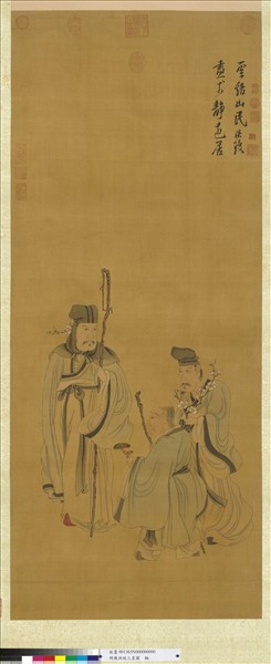 陳洪綬(西元一五九八-一六五二年),浙江諸暨人。字章侯,早年自號蓮沙彌,後號老蓮。明亡後,又號悔遲、勿遲。自小即富繪畫天才,四歲曾於白壁畫關公像,善山水,尤工人物。與崔子忠齊名,號南陳北崔。  福祿壽三星,二人拄杖,有持梅枝者,亦有執靈芝者。傅色清雅,線條清細圓勁,當為高古游絲描一系。陳洪綬屬變形主義,畫人物喜用誇張手法,作物體的變形。比例上往往不按規矩,或奇或怪,或加以扭曲,卻別有諧趣。