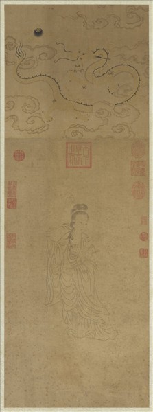 這幅畫軸畫一位中年婦女手抱孩童,右手拿著一枝楊柳,左手捧著一個水碗,是一尊送子觀音。這尊觀音的世俗色彩濃厚,祂眼睛散放著悲愍的光芒,好像一位慈祥的母親。祂的臉形、髮絲、手腳都用淡墨細筆畫成,筆力穩健。可是衣紋則是用楷書抄錄《法華經.普門品》的經文來表現,全文從觀音菩薩左臂靠近孩童的頭部開始,字字連續,字跡端秀,一絲不苟,充分表現了作者虔誠的宗教情懷。