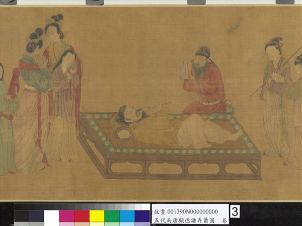 顧德謙,南唐時江寧人,善繪人物,傳顧愷之法,南唐後主李煜讚之曰:「古有愷之,今有德謙,二顧相繼為畫絕矣。」傳世畫蹟有蕭翼賺蘭亭、太上老君度關等故事人物畫。本幅為絹本設色畫。圖中一人臥胡床仰吹簫管,一人執檀板依榻坐,一少年立整冠。二婦人相對語;侍女五人一舞四執役,一童奉香爐進。用筆柔細,設色淡雅,表現出悠閒愉悅的情調。拖尾有晚明松江畫家孫克弘和宋旭之觀款。