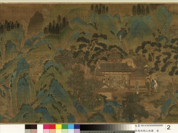 趙伯駒(生年不詳,約卒於西元一一六二年),字千里,宋太祖七世孫,趙大年之子。仕至浙東兵馬鈐轄。善畫山水、花果、翎毛及人物,樓閣界畫尤妙。 上林苑乃秦朝舊苑,漢武帝擴建。周圍三百里,離宮七十所,規模宏偉。苑中飼養禽獸多種,,春秋二季皇帝時常至此圍獵。本卷青綠設色,畫上林苑帝王圍獵情景。人物眾多,車輦儀仗無一不備。
