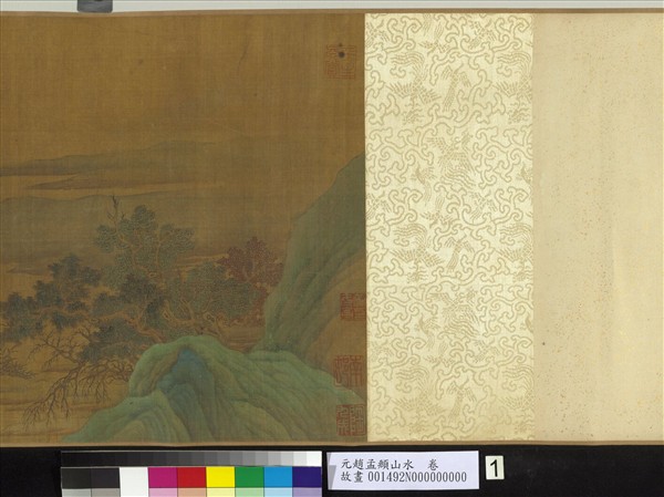 本幅描繪文士們於山水中或垂釣、或會友、或讀書等,一派隱居山水的情調。房舍與庭園等細節有明代吳派繪畫遺韻,然山體更講究走勢,苔點密佈於山稜線以模塑山體量感,應為十七世紀以後受董其昌畫風與理論影響的作品。此種青綠設色與皴染並用的作品常歸於趙孟頫名下,為明代中後期發展趙孟頫青綠風格的成果。(20100710)