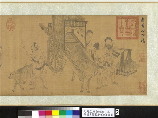 本卷繪魏壽春縣令時苗清廉之故事。時苗為人嫉惡謹守,建安中任壽春縣令,深受愛戴。初到任時惟以一母牛拉車至,居官年餘,牛生一犢,及其去職,亦只有一車一母牛,連小犢都不願帶走,只因小牛乃生於當地,可見時苗之一介不取。民眾不忍見其離去,紛紛夾道相送悲泣。 畫上幅末有趙孟頫紀年款印。描繪人物之圓轉勻長線條雖近於趙孟頫的風格,但筆墨仍有差異,應為後人所偽託。