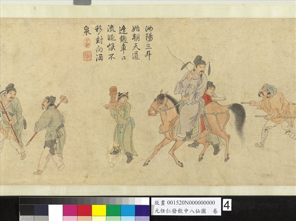 任仁發(西元一二五四-一三二七年),元代著名書畫家、水利學家,尤精畫人物、鞍馬,技法堪與趙孟頫相媲美,在當時享有盛名。此畫根據杜甫〈飲中八仙歌〉的詩意,描繪唐代李白等八位大詩人吟詩醉酒的生動情態,人物造形具雅逸趣味,畫面簡潔而設色清雅。然筆墨力道稍弱,不類任仁發,當是出於明人手筆。卷前右下有項元汴千字文第三0二「甚」字編號,及「項墨林鑑賞章」等諸印。