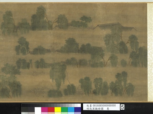 仇英(約西元一四九四-一五五二年),江蘇太倉人。字實父,號十洲。工畫山水、人物,兼擅花鳥。   本幅舊題為仇英所作。明清時代之考試主要分三級,初級為院試,及格者通稱生員,亦稱秀才。二級為鄉試,中者為舉人,榜首稱解元。最高一級為會試,舉人均可參加,中者稱貢士,榜首稱會元。貢士得入殿廷由皇帝面試,殿試成績最高者為狀元,次名稱榜眼,三名稱探花。畫中觀榜人潮洶湧,高中者興奮地登馬而去,落榜首,則滿臉沮喪,由人攙扶,頹然而返。