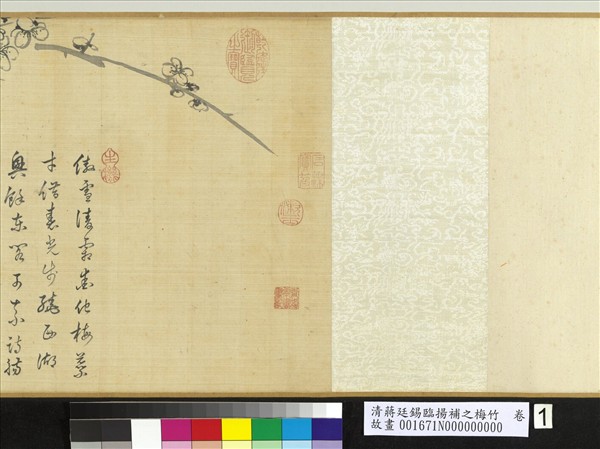 蔣廷錫(西元一六六九-一七三二年),江蘇常熟人。字揚孫,號酉君,又號西谷。官至文華殿大學士,工畫花卉草蟲,以逸筆寫生,沒骨花鳥畫繼承惲壽平風格。   梅竹盤折於畫面中心,枝條橫斜穿插,構圖奇峭。筆法爽捷勁健,錯雜粗率而有韻致,別有逸趣。用淡墨渲染枝幹,重墨點綴花蕊,墨色淡逸雅致。