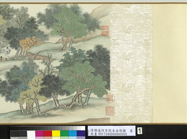 謝遂,生卒年里不詳,乾隆年間(西元一七三五-一七九六年)供奉內廷,工畫人物。   本卷畫金陵城的城市村廛,店鋪街景,市井人物,細節繁多,熱鬧非凡。全圖用筆精謹,人物神情生動。根據幅上作者款識,畫成於乾隆五十二年(西元一七八七年)。本院收藏中另有一卷楊大章仿宋院本金陵圖,並列比較,發現二卷構圖佈局均十分類似,唯此卷設色鮮麗,在細節人物方面略有減省。