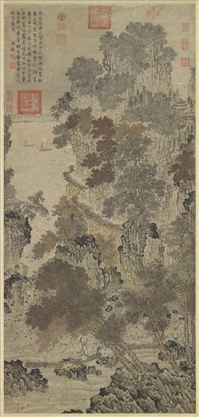 嵯峨的山嶺間點綴著飛瀑、樓觀,陡峭的崖壁上架著險峻的棧道,將「蜀道難」的景致一表無遺。木橋上有一文士蹇衣回首,身後跟著兩位隨從,一位牽驢,一位荷著行囊。本幅無款,舊傳為五代關仝(約十世紀)之作,可是從山石的皴法或本幅的筆墨看來,應該是明代畫家所作。