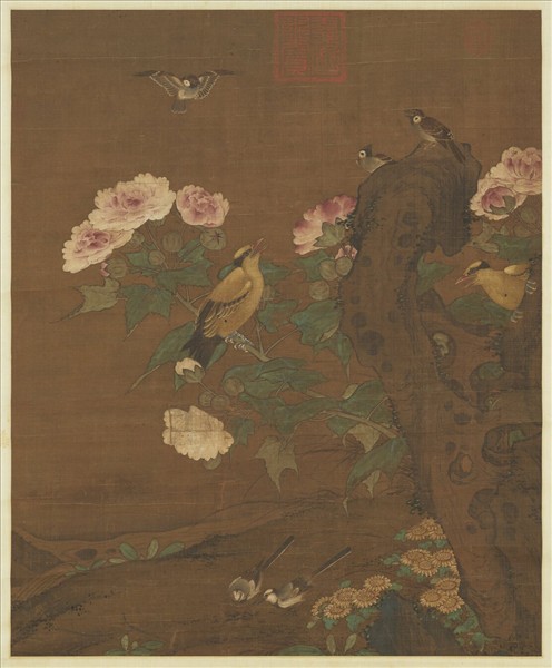 本幅畫芙蓉盛開,與奇石交相掩映,石下尚有數株雛菊。一對對麻雀與鶺鴒互相顧盼唱和,唯有一隻麻雀孤獨地在空中飛翔。本幅無款,舊傳為五代南唐(十世紀初)徐熙之作,然細審本幅的筆墨與徐熙不類,當出自後人之手。