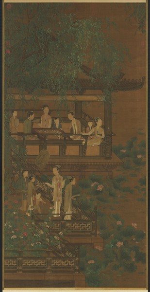 界畫亭榭臨池,前後碧柳四垂,二女亭中對奕。亭外池荷盛開,翠葉田田。仕女或倚欄垂釣或持扇觀荷,一派夏日悠閒景象。通幅屋界、衣飾刻畫精細,粉花綠葉著色清麗,本幅舊傳為南唐周文矩之作,唯筆墨、器用皆顯露出明清習氣。 周文矩(活動於西元十世紀),建康句容(今南京)人。仕後主李煜為翰林待詔,能畫冕服車器,尤工仕女人物。
