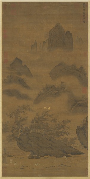 趙幹,南唐時江寧(今南京)人,為李後主(九六一—九七五在位)畫院學生,山水多作江南景,論者謂其深得浩渺之意,無一點朝市風埃。 山谷間流水潺潺,五名行旅提挽褲腳,相繼涉水渡溪,背後的樹木已呈枯黃,後嶺復重重環抱,此境益為幽深絕塵。舊傳本幅為趙幹之作。