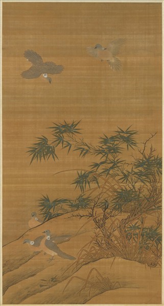 黃筌(卒於西元九六五年),四川成都人,字要叔。十七歲即任職後蜀畫院,曾師法刁光胤、李昇等名家的長處,而有自己的面貌。 幾隻珠頸斑鳩活動於郊原上,其中二隻飛翔於低空,另外三隻正漫步於竹叢邊。流露出在大自然間怡然自得之情景。作者注重寫生,對鳥的形狀以至神態,都極用心觀察,如羽毛層層疊覆的變化也都詳加描繪。本幅舊傳為黃筌之作,與本院所藏的另一幅宋人竹石鳩子圖在構景方面十分相近。