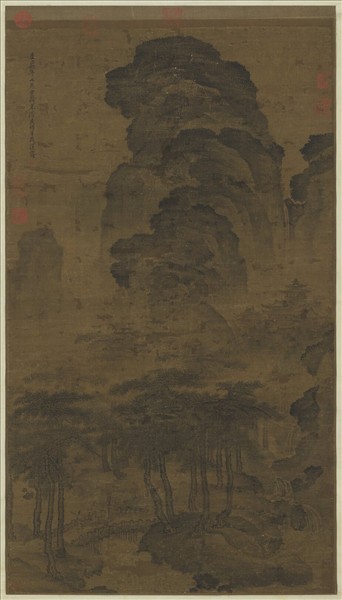 朱德潤字澤民,睢陽(今河南商丘)人,生於至元三一年(西元一二九四),死於至正二五年(西元一三六五)。他擅長於山水、人物也畫得不錯。 這一幅描繪兩名士人帶著一名童子,在松林裡漫步悠遊。遠方是重疊的山巒,山谷中有樓閣隱約可見。一道山泉從山峰高處順流而下,且穿通松林,使整幅畫能上下一氣相連。用筆穩重沉著,山石,叢林的寫形和用墨有圓渾厚重的惑覺。