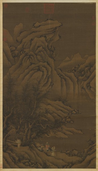袁安為東漢汝南人,字邵公。任官河南尹,慈愛為政。畫中緋衣騎馬者是洛陽令,大雪時出巡,至袁安家,見門前雪並不掃除,鄰人以袁已死,就令人叩門進入。袁安僵臥在家,問他何不出門。回答:大雪時,眾人皆餓,不宜勞煩別人。洛陽令認為他是賢人,舉薦他為孝廉。 本幅款題盛懋所畫,但畫法已是明人學他的風格,而加以改變者。盛懋(約十四世紀前期)杭州人,字子昭。