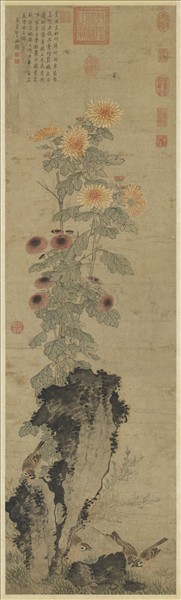 奇石旁邊,兩株不同品種的菊花,爭相綻放著美麗的花朵。兩隻蜜蜂被馥郁的香氣所吸引,盤旋在空中,久久不忍離去。石縫之間,還有四隻麻雀在跳躑與覓食。畫幅下方沉靜的墨彩,與上段妍麗的設色,不僅形成強烈的對比,也憑添了秋日天氣舒爽的感受。 本幅雖然沒有作者的署名,無法確知出自何人所繪,但畫中形象準確,而且下筆快捷,確實稱得上是寫意花鳥畫的佳作。