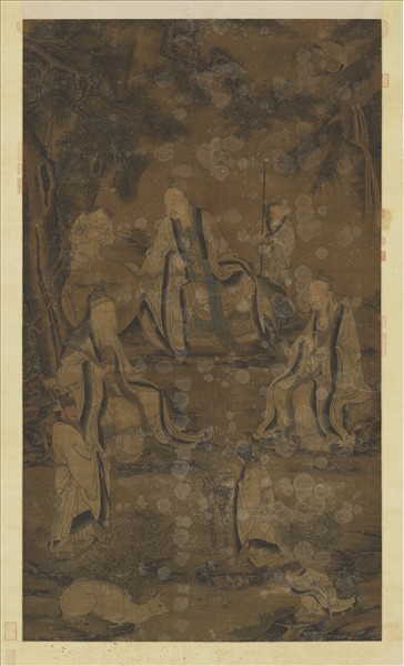 三清為道教尊奉的三位最高神的統稱。依畫上品字形排列,上方為玉清元始天尊,其左手方為上清靈寶天尊。右手方為太清道德天尊。三清尊神是道教哲理「三一說」的象徵,《老子道德經》說:「道生一,一生二,二生三,三生萬物。」三清尊神就是「道」的人格神化。自唐宋以來,三清尊神主要供奉在道教宮觀裹的三清殿。本幅主尊之外,一星官抱手侍立,一玉女添香,仙童一潑水戲龜,一持羽扇轉頭觀鶴,一叉手伏身。道教科儀用三清神仙像,畫像均以正面為主,此幅則畫仙界平和至樂。