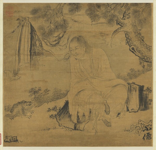 此幅畫老松下,仙人劉海蟾彎首斜身坐於岩上,目視畫幅右下三足蟾蜍,蟾蜍作睜眼凝視貌,似有舉勢待發之狀,動靜之際,四目交集,甚為生動。 幅上「小僊」二字,乃明代畫家吳偉(一四五九—一五O八年)之稱號,然疑為後加之款。此畫樹木、座石、岩崖、瀑布等寫法皆異於吳偉潑墨粗放之風貌,而人物描寫雖佳,亦不類其一貫風格,完成時代約在明末。