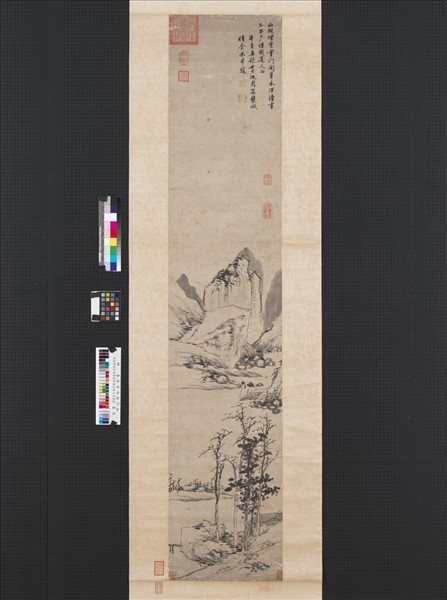 周結緣僧寮,與高士往還,如大雲菴,竹堂寺皆常見於畫蹟。此幀款署弘治辛亥孟秋二十日,寓雙峨僧舍。雙峨僧舍者,疑即承天能仁寺,舊在吳縣皋橋之東,以寺前有二土阜,亦名雙峨寺。成化十年住持道澤重建大雄殿,吳寬為之作記。崇禎戊寅,浚井,得鄭所南鐵蘭心史。清康熙三十一年,寺廢。此幀紙狹長,圖纔及紙長之半。秋林稀落,四五樹作一叢,背後小山數叠,用意微師倪瓚,筆草草而不求工,然荒率中自有不可及處,六十五歲畫。(江兆申)