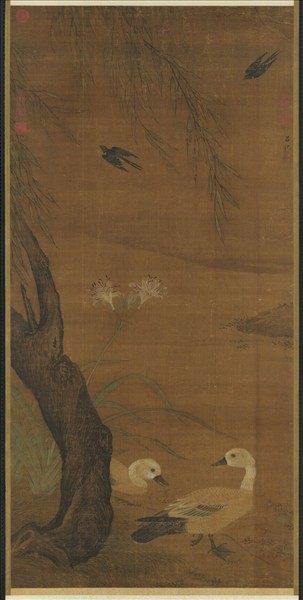 呂紀(活動於西元一四七七-一四九七年間),浙江鄞縣人。字廷振,號樂愚,一作樂漁。花鳥初學邊文進,後摹唐宋諸名家筆,始臻其妙。弘治(西元一四八八-一五○五年)間被徵值仁智殿,為錦衣衛指揮使。   本幅畫溪岸柳樹下,萱花盛開;一雙飛燕臨空掠過,岸上則止息瀆鳧一對。其中柳樹幹之皴法,以及萱花、柳葉與雙鳧之鉤畫用筆,甚得呂紀之筆意,若自神韻觀之,則仍顯得略遜一籌。