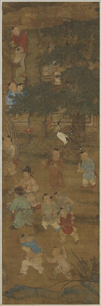 仇英(約西元一四九四至一五五二年),字實父,江蘇太倉人。少時移居蘇州為學徒,可能以臨仿古畫為業。後學畫於周臣,又受到文徵明的賞識,與蘇州文人時有往來,由文氏引介,曾先後在大收藏家項元汴和陳官等人家作畫。項聲表稱他:「所覽宋元名畫千有餘矣,又得性天之授,餐霞吸露,無煙火氣息。」被譽為明四大家之一。   繪庭院中群嬰嬉戲之歡樂景象。或彈琴、或騎木馬、或讀書等,表現出孩童生活的情趣。此圖人物畫法與仇英平日筆不相類近,恐係後人偽託。