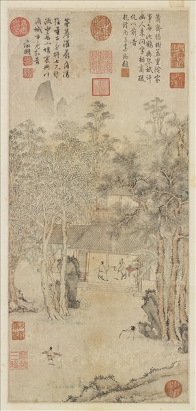 文徵明(一四七○-一五五九),初名壁,以字行,更字徵仲,號衡山居士,長洲(江蘇蘇州)人,為明代吳派領導畫家。五十四歲以歲貢至京,授翰林待詔,與修武宗實錄,後厭倦京師生活,返居故里,專意藝事。   本幅設色界畫重樓敞軒,賓主二人坐堂上對語,庭前桐蔭高松,一鶴啄苔,一童子捧琴至。筆墨清勁,設色雅淡,樓閣雖作界畫法,仍保持文人畫家雅逸之氣息。