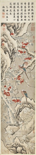 陳栝,字子正,號沱江,生卒年不詳。江蘇長洲人,陳淳之子,秉性豪放,飲酒縱誕,有竹林賢達之風。善畫花卉,筆蹤放浪,頗饒生趣。本幅畫巖崖崒石間,翠竹挹青,梅茶吐艷,水仙綻花,瑞雪山禽相映成趣。