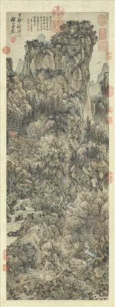 謝時臣(西元一四八八至一五六七年以後),字思忠,號樗仙,江蘇蘇州人。善繪山水,能作屏障大幅,畫風出自沈周。 疊嶂深林,峰外留白不多,意欲取法王蒙丘壑充實,山林蓊鬱之意境。通幅筆觸細密而繁複,鉤皴點樹,沈厚老到。染山點苔,用赭及花青,尤以赭紅點染各景,提醒了畫面之彩度。款題「丁卯」,即隆慶元(一五六七)年,時謝氏年已八十,是為暮年之作。