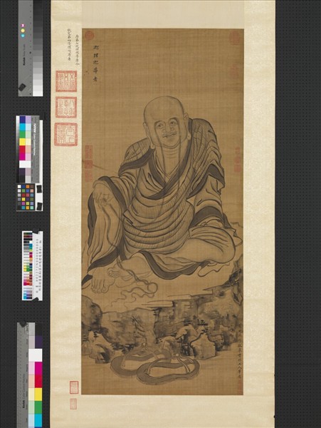 吳彬(活動於西元一五六八至一六二七年),字文仲,福建莆田人,流居金陵(今南京)。能書善畫,畫山水、佛像、人物皆能自立門戶,造形奇異迥別於前人。山水布置亦新奇而不摹古。   本幅為吳彬畫十六羅漢圖之一,構圖與浙江錢塘聖因寺傳為貫休所作的十六羅漢圖相同。吳氏摹筆忠實,造型、用筆盡量求同,可謂形神兼備。