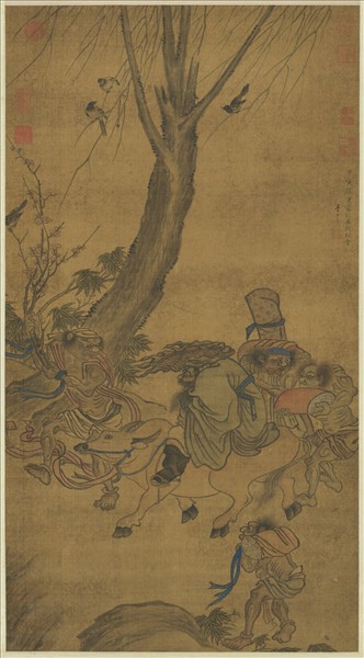 李士達(十六—十七世紀間),吳縣(今江蘇蘇州)人。號仰槐,一作仰懷。畫兼人物、山水,又善論畫,嘗謂畫有「五美」、「五惡」,甚獲推重。享壽約八十餘。 本幅畫鍾馗戴笠騎牛,前後隨侍四名鬼役,一持梅枝,一荷琴囊,兩捧書軸。配景上方繪寒柳迎風搖曳,四鵲飛鳴其間,道旁則見綠竹傍生。畫絹質地甚為粗疏,筆描線條膠著,敷彩之外,復加淡墨染暈,致令通幅墨氣凝重。與院藏李氏之「坐聽松風」、「關山風雨圖」風格均不類,故疑係後人託名之作。