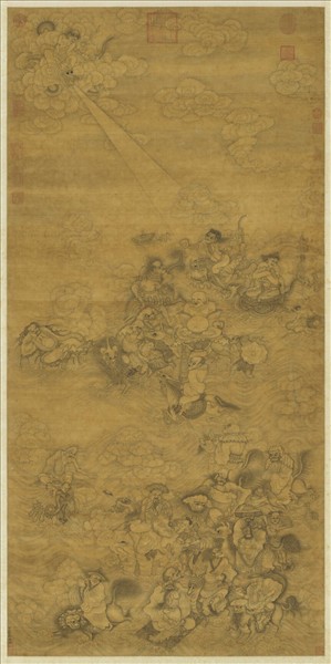丁雲鵬(西元一五四七或一五四八-一六二八年後),安徽休寧人。字南羽,號聖華居士。善畫佛道人物,得唐吳道子法,又白描師法李公麟,為晚明人物畫名家。    海天相交,波濤翻舞,團雲變幻之間,十八位羅漢由乘騎與羅剎簇擁伴隨,上下遊走於虛空之中,各顯神通。人物與動物交織成一幅恍若觥籌交錯的動感畫面,而羅漢誇張變形、滑稽的造形,使全畫瀰漫著類似卡通的趣味效果。