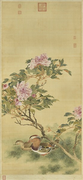 牡丹迎風搖曳,鴛鴦依偎於花叢下。畫家特意將這兩項寓意「富貴」「祥和」的題材結合在一起,為整幅畫面帶來了祥瑞之氣氛。