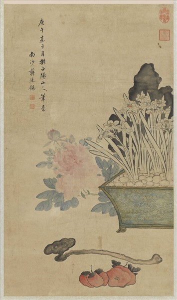 蔣廷錫(西元一六六九-一七三二年),江蘇常熟人。字揚孫,號酉君,又號西谷。官至文華殿大學士,工畫花卉草蟲,以逸筆寫生,沒骨花鳥畫繼承惲壽平風格。   蔣廷錫花卉之作與傳統文人墨卉有深遠關係,明代沈周、陳淳、徐渭對蔣氏有相當的影響。「歲朝圖」為其仿陳淳之作,然風格仍較偏向文雅規矩一路,應與其個性及在朝為官有關係。