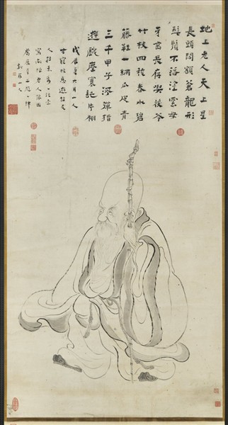 華嵒(西元一六八二-一七五六年),福建上杭人。字秋岳,號新羅山人。初寓杭州,後客維揚鬻畫。人物、山水、花鳥、草蟲無一不精。雖與八怪同時,然筆墨卻了無霸悍氣習,在揚州畫家中獨樹一格。 本幅純以墨筆繪南極老人。論者嘗謂,華嵒畫人物脫胎自馬和之的「蘭葉描」,若以「畫壽星」來相印證,人物衣袖在乾渴中猶屢現頓挫,與馬氏存世作品互異,故知華嵒於習古之外,亦有所創新。