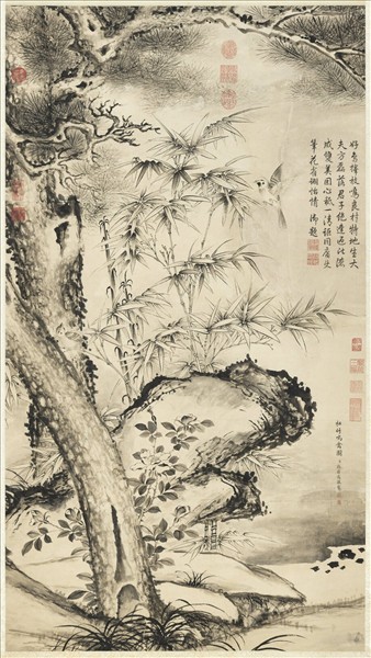 清張若靄松竹鳴禽圖高宗御題 軸