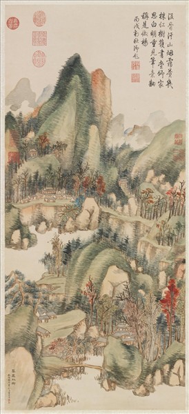 這幅畫與一般山水畫不同,直接以深赭色勾山石與樹的輪廓,然後用淡綠或淡赭色塗染山石的表面,再以濃密深綠的平行橫點,顯示岩石圓弧形的紋理。點綴在深林中的紅葉,與山石的翠綠,形成明顯的對比。這種直接以色彩描繪物象的畫法,稱為「沒骨畫」,相傳六世紀初的張僧繇與八世紀的楊昇擅長此法,至十六世紀時,董其昌重新創作此類畫法。 董邦達是乾隆朝重要的宮廷畫家,他是浙江富陽人,1733年進士,在乾隆朝歷任起居注官、侍講學士,1747年入直南書房,後來官至工部尚書。他擅長山水畫,承襲明代董其昌與元代的文人畫風,作品頗受乾隆的賞識。本幅即有乾隆1766年的御題詩,前兩句描寫畫中景物,後兩句直率的指出雖然題作「仿楊昇筆意」,其實是近似董其昌。(何傳馨)
