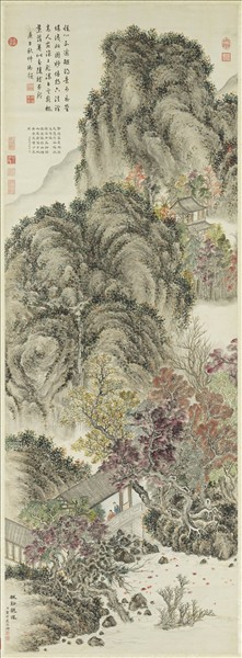 董邦達(西元一六九九-一七六九年),浙江富陽人,字孚存,號東山。雍正癸丑進士。乾隆時,以博學精考核,命入內廷,襄編石渠寶笈諸書,後仕至禮部尚書。性好書畫,山水喜宗元人筆墨。   峻嶺深壑,跨橋敞軒裡,高士坐賞秋光。本幅以朱紅、黃綠寫來樹木轉變特色,用色艷而不俗,頗見作者刻意強調之意圖。畫中山巒以枯筆,用披麻、雲頭兩種皴法交相運用,顯出受元朝王蒙畫法影響。