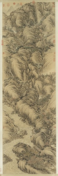 董邦達(西元一六九九-一七六九年),浙江富陽人。字孚存,號東山。雍正朝進士,乾隆時襄編《石渠寶笈》諸書,仕至禮部尚書。性好書畫,山水由董其昌入手,得元人筆墨精神,而以清麗取勝。    本幅畫高山陡棧,峰巒迴曲,江流湍急,行旅沿嶇崎山徑而上,下有旅舟茅店。山石勾勒擦染,仿古氣息濃厚,深具筆墨趣味。