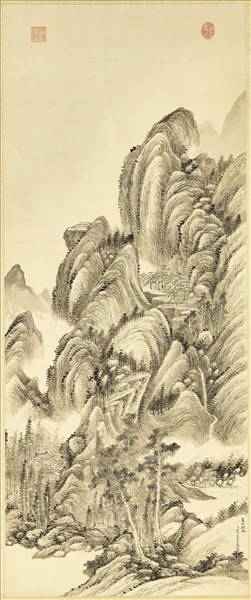錢維城(西元一七二○至一七七二年),字宗磐,號幼庵,一號稼軒,又號茶山,江蘇武進人。乾隆十年狀元,官至刑部侍郎。從陳書學畫寫意折枝花卉,遂成名手。供奉內廷,為畫苑領袖,著有茶山集。   本幅山水丘壑幽深,氣韻沈厚,不以造化為師,全法南宗正統畫派,其丘壑、樹石之筆法、墨法皆有公式化的趨向。重山疊嶺之中,煙霧瀰漫,畫面水份凝重,氣氛營造之下,頗有山雨欲來風滿樓之意。