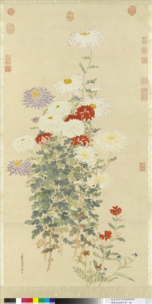 錢維城(西元一七二○-一七七二年),江蘇武進人。字宗盤,號茶山,晚號稼軒。乾隆乙丑(一七四五年)狀元,仕至工部侍郎。初從陳書學花卉,後改畫山水。折枝菊花一叢,用筆極工穩而有力,設色穠艷,重用鉛粉。雖出陳書之門,不無鄒一桂影響。