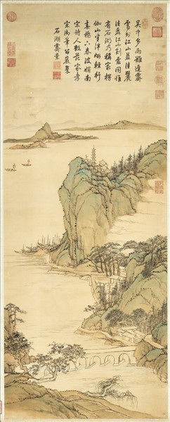 張宗蒼(西元一六八六-一七五六年),字默存,號篁村,吳縣(江蘇蘇州)人。善畫山水,師黃鼎,是原來王原祁的再傳弟子。乾隆辛未(一七五一)入都,任內廷祇侯,後官至戶部主事。 石湖在吳縣西南二十里,湖山掩映,風景勝絕,是蘇州名勝之一。此幅是「姑蘇十六景」的一幅,畫行春橋、楞伽山、治平寺諸景。以淡青設色,表現雨過天青,湖水清澈,山巒明淨的感覺。