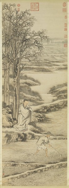 金廷標字士揆,烏程(浙江吳興)人。善人物,兼工山水、花卉。清高宗南巡,進白描羅漢冊,稱旨,召入內廷供奉。生卒年不詳,作品見於乾隆二十五年(一七六○)至三十二年(一七六七)間。 本幅繪荒山田疇間,一位頭戴笠帽的老翁,正弓背專注地耘草。身後,一位高士著巾服朱履,向老翁雙手作揖,狀甚恭敬。筆墨流暢富機趣,人物衣紋用筆粗放,收放間有提頓。臉部以暈染分明暗,蓋宮中畫家受西法影響所致。