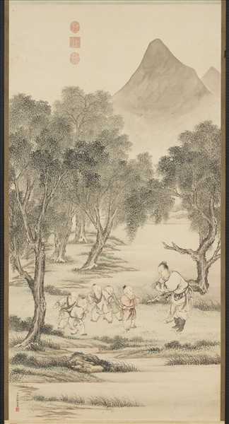 金廷標,字士揆,烏程(今浙江湖州)人。工寫真,並能繪人物士女及花卉。善取影,白描尤工。亦能界畫。清高宗二十五年(西元一七六○年)南巡時,金廷標進白描羅漢冊,稱旨。命入內廷供奉。 本幅繪山水人物。遠山二重半藏於嵐霧中,近景坡堤邊柳樹成林,層次分明。郊道上,五童子與一成人期遇,為首童子與之拱手招呼,應為舊識。諸童似原在嬉戲中,雖彼時皆佇足睇視來者,面目猶現歡躍神情。