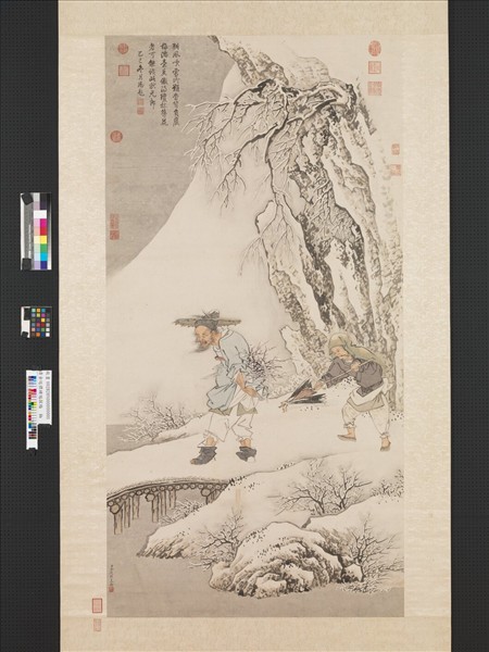 金廷標(十八世紀),字士揆,烏程(今浙江湖州)人。父金鴻,亦善畫,廷標幼承家學,工寫真,兼作白描人物、仕女、花卉、界畫等。清高宗二十五年(西元一七六○年)南巡時,進白描羅漢冊,稱旨,命入內廷供奉。 本幅畫鍾馗戴笠,背束梅花一捆,擷衣欲行經雪橋;後一人口銜梅枝,手撐破傘隨之。清代,鍾馗已晉身為五月花神,但仍有少數畫家,鍾愛描繪鍾馗於雪天探梅的雅興,聊以「借景抒懷」。金氏此作,當即欲藉助鍾進士訪梅的情境,隱喻畫中人孤高不群的內在性格。