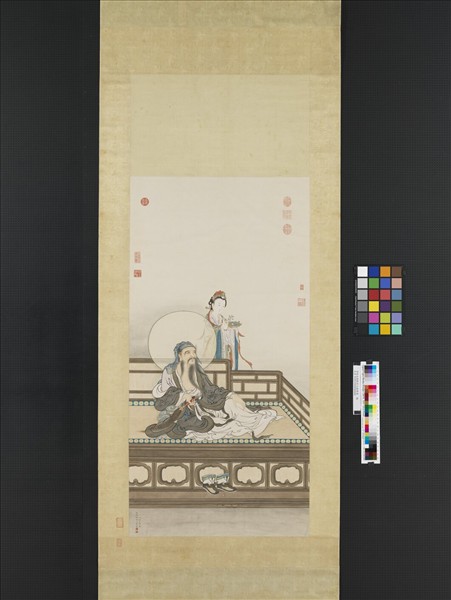 姚文瀚(約活動於西元一七三六-一七九五年),北平人。號濯亭,乾隆時供奉內廷,工佛道人物,《秘殿珠林》評其道釋畫,可與嚴宏滋、丁觀鵬比美。   此畫臨仿「宋人維摩像」,畫維摩詰坐於插屏式羅漢床,右手執麈尾,斜靠於獅形憑几上,其後有天女執花盆。人物設色開面,隱約間似受同時人丁觀鵬之影響,然筆墨精湛,別具典雅之致。