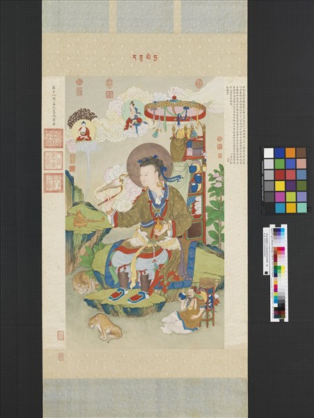 姚文瀚(活動於西元一七五二年前後),順天(北平)人。號濯亭,乾隆時供奉內廷,善畫佛道人物。   居士羯摩札拉,長長的頭髮盤在頭上如花冠,背負經書一冊,坐在無量佛面前。居士手持拂子與寶瓶。向羯摩札拉致敬!《羅漢禮供》   據裱綾上的藏文標名及畫中人物形貌,本幅與第十八尊者的中文法號錯置,本幅應為「第十七號羯摩札拉居士」。兩幅詩塘上的藏文都是正確的,可能書寫中文者不識藏文及《禮供》的順序,所以錯置了中文法號。畫中尊者一如《禮供》所言背負經篋,形似負笈的行腳居士,正卸下經篋,端坐岩上憩息。右手執拂塵,左手握寶瓶,足下伏虎,前方石案上獸鎮噴水,幻化出一尊阿彌陀佛小像。此一形象早在唐代敦煌繪畫已有之,或與大唐高僧玄奘有關,後由敦煌傳入西藏。