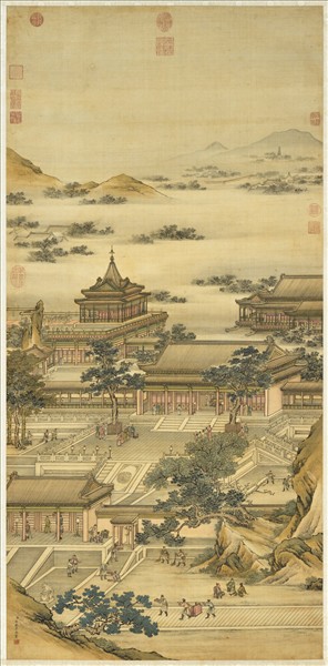 張廷彥(西元一七三五-一七九四),乾隆年間供奉內廷,善畫人物。 殿閣重重,僕役忙於傳遞食盒,帝后在群臣與樂工之伴隨下,賞秋月於樓台之上。畫風似以明院畫為楷模,但筆法略覺疎散。
