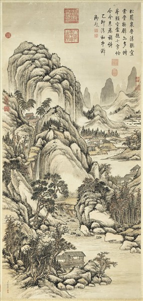 方琮字黃山,乾隆時(十八世紀後半)的宮廷畫家。學畫於張宗蒼(一六八八-一七五五),深得其傳。 此圖繪層巖溪閣,二人坐閣中聆聽松籟泉音。全畫構圖平穩,左邊山石高聳,右邊谿流迂緩。用筆沉著,山石皴法以乾、濕、濃、淡各種墨色層層擦染,以顯示蔥蔚沈厚的氣勢,頗異於同時宮廷繪畫甜俗之習。