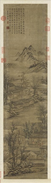 曹夔音,江蘇省江寧縣人。乾隆時以畫供奉內廷,工畫山水。生卒年不詳。 本幅畫范成大臘月村田樂府詩中的賣癡獃詞。蘇州風俗,小孩們惟恐自己癡獃,所以想把「癡獃」賣掉。因此在除夕守歲後,小孩們遊行街巷,喊賣著癡獃。