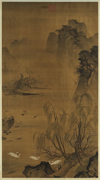 此一近似山水畫之大幅作品,雖傳為呂紀所作,然究其筆墨,非呂氏之真蹟,惟確曾受其畫風之影響。而畫幅上之名款應無誤,故可能是呂紀於宮中為應宮廷所需,而由其作坊內之弟子代筆,再署其名款者。   呂紀(活動於西元一四三九-一五○五年間),浙江鄞縣(今寧波)人。字廷振,號樂愚,一作樂漁。弘治(一四八八-一五○五)間值仁智殿,官至錦衣指揮。花鳥初學邊文進,後摹唐宋諸名家筆,結合工寫,益臻其妙。