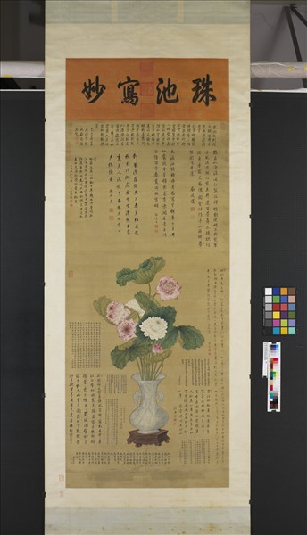 蔣廷錫(西元一六六九-一七三二年),江蘇常熟人。字揚孫,號酉君,又號西谷。官至文華殿大學士,工畫花卉草蟲,以逸筆寫生,沒骨花鳥畫繼承惲壽平風格。   康熙六十一年(一七二二)蔣氏寫生宮中御花池之重瓣蓮花,花卉部份有惲壽平風韻,但過度強調筆墨陰暗的區別,使得畫面較為呆板刻劃。畫木質瓶座具有西洋透視法的立體感,相當寫實。此圖有可能是其門生代筆之作。