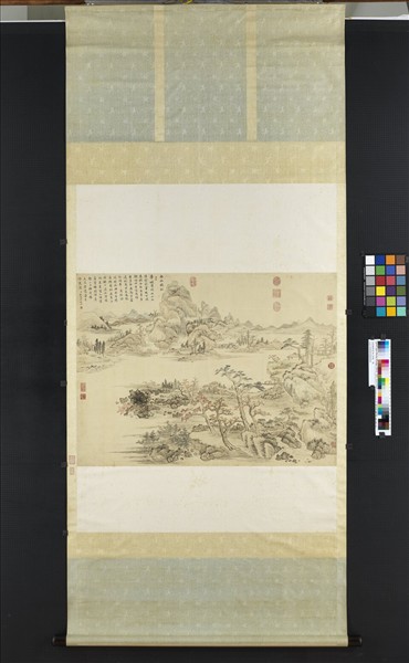 張鵬翀(西元一六八八-一七四五年),嘉定(今屬上海市)人。字天飛(或作天扉),一字抑齋,號南華,人稱漆園散仙。善繪事,尤精山水,師承元四家。 畫大江兩岸景緻,一邊是茅亭紅樹散置在蜿蜒的坡岸上,並點綴著數處湍泉;另一邊則是崇山垂瀑,遠山層疊,漸行漸遠。通幅用筆用色疏朗,讓人充份領受到一份秋高氣爽的感覺。